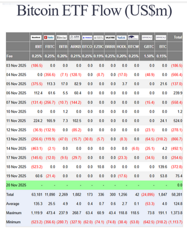 The current downturn reflects a sharp correction rather than a news-driven shock. Ironically, the launch of Bitcoin ETFs—which pushed prices higher over the last two years due to heavy institutional inflows—has now become a source of downside pressure. When sentiment turns cautious, the same large investment vehicles can reverse the trend with equally strong outflows. Data from Farside Investors shows that Bitcoin ETFs have experienced steady withdrawals throughout the month, totaling nearly –$3B to date.