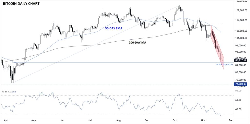 The 14-day RSI indicates oversold territory, but that does not guarantee a near-term reversal—especially since meaningful support does not appear until the 78.6% Fibonacci retracement area around $85,600. Should that level fail, traders will look toward the $74,000 region, marking the previous yearly low.